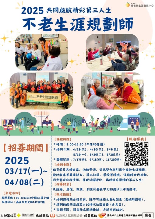 #嘉義市橘世代生涯發展中心 誠摯邀請您一起加入 #不老生涯規劃師 行列,讓我們一同共創高齡友善城市、深耕長者服務~