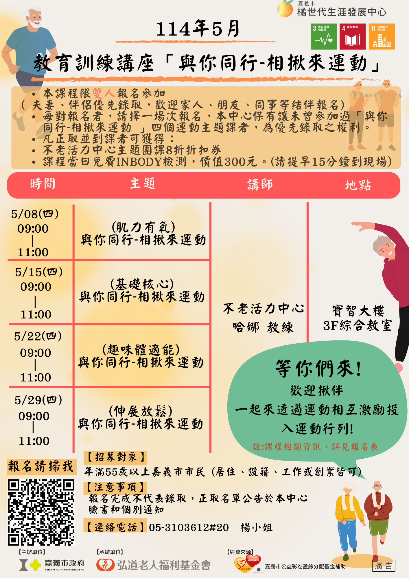 自 4 月起至 10 月辦理四大類型的主題課程,攜手「終身學習」,今年度「超優質免費講座」內容多元豐富又實用,千萬不要錯過,就讓嘉義市橘世代生涯發展中心陪伴您度過豐富的精彩第三人生! (1) 儲備銀肌力的「健康促進」,教你安全運動聰明吃。 (2) 關注自身心靈的「心理安適」,用心傾聽內在聲音,由內而外照顧自己。 (3) 如何準備「終活規劃」,透過重整與檢視,著手實踐在未來。 (4) 超前部屬自己的「退休預備」,不用上班的日子一樣很精采。