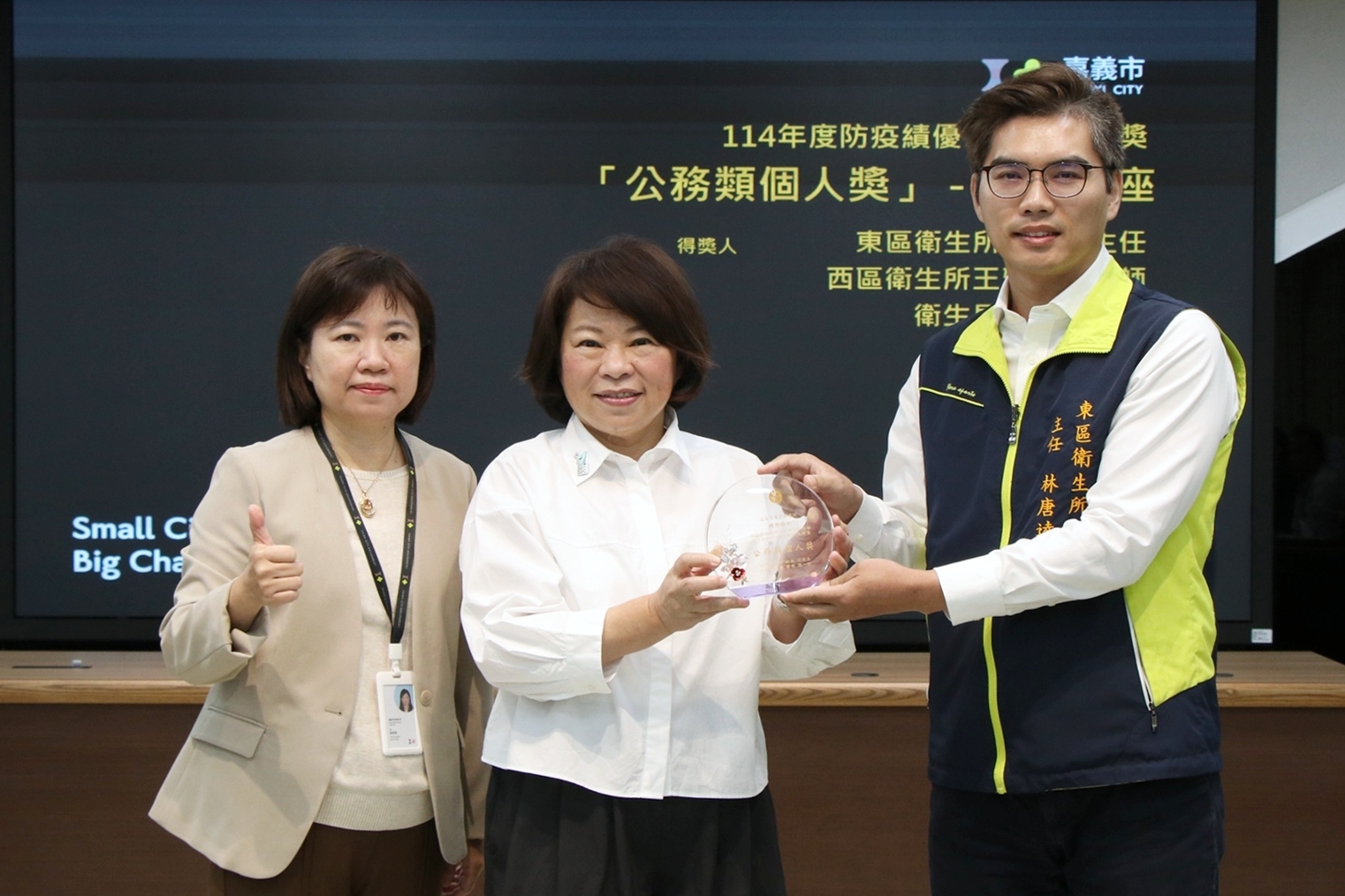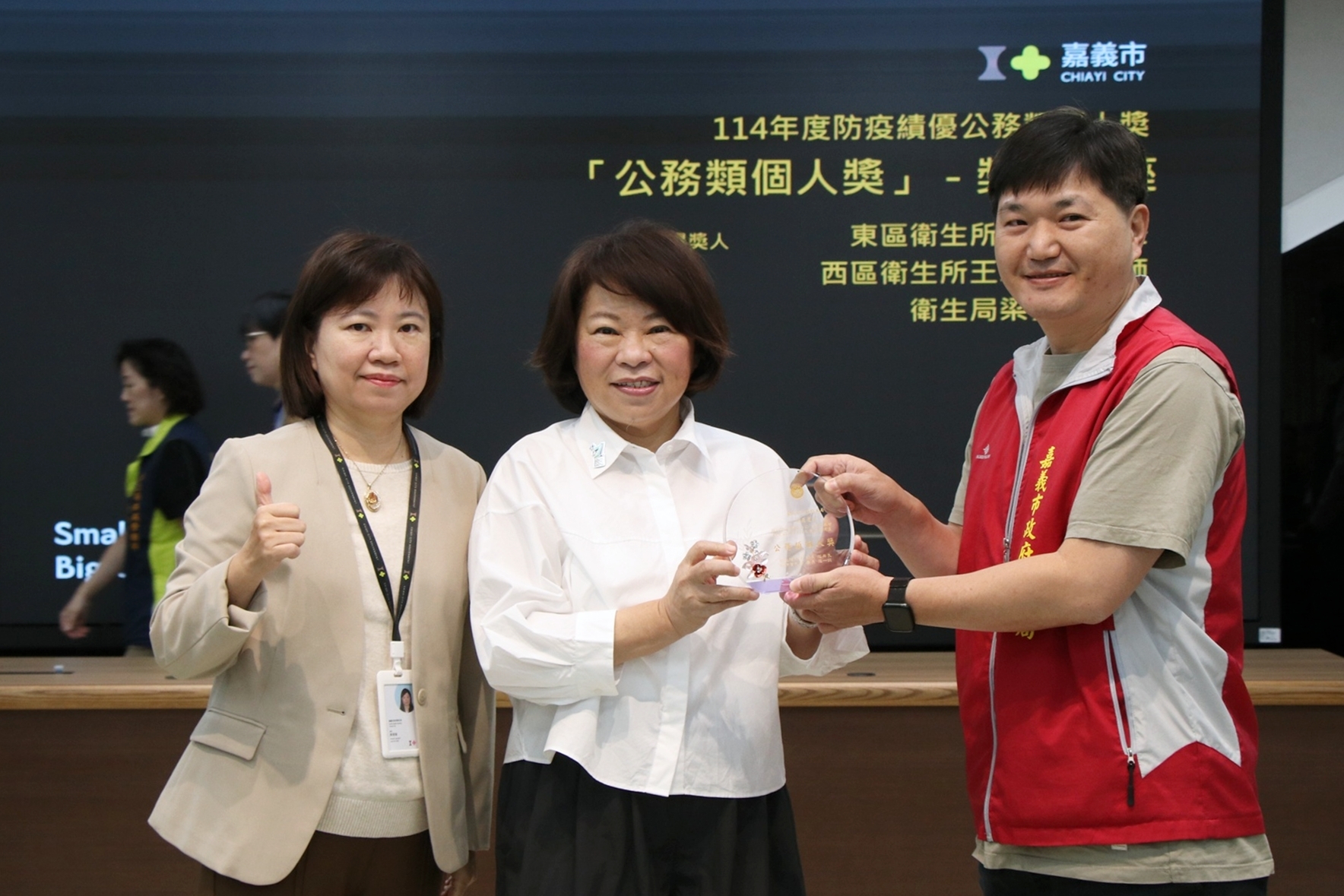 此外,疾病管制署於11月25日頒發114年度防疫績優個人獎,在全國眾多參選者中,嘉義市亦有三位同仁獲獎,包括東區衛生所主任林唐逵、西區衛生所醫檢師王雅慧,以及衛生局技士梁義慶。他們在檢驗認定、疫情監測與社區防疫上展現高度韌性與即時應變能力,守住嘉義市的公共衛生安全。
