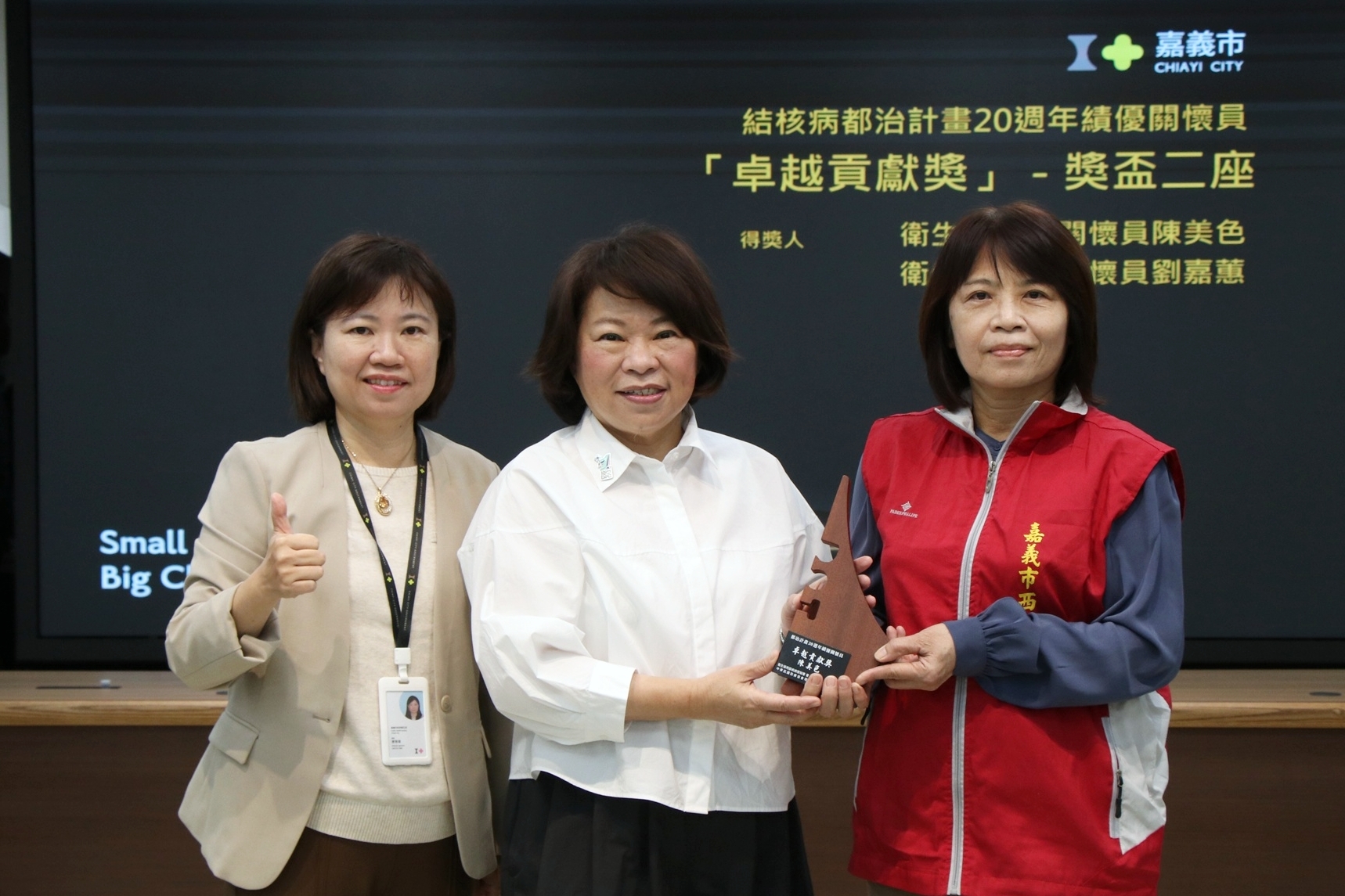 結核病防治邁向20週年,疾病管制署與中華民國防癆協會於9月24日首次舉辦都治關懷員表揚活動,本市共有兩位優秀專業人員獲得「卓越貢獻獎」,包括資深關懷員陳美色(服務20年)與劉嘉蕙(服務13年)。兩人多年來深度投入社區結核病患者追蹤、支持與衛教,陪伴無數家庭度過治療期,以高度專業與溫暖的服務成為城市不可或缺的默默力量。