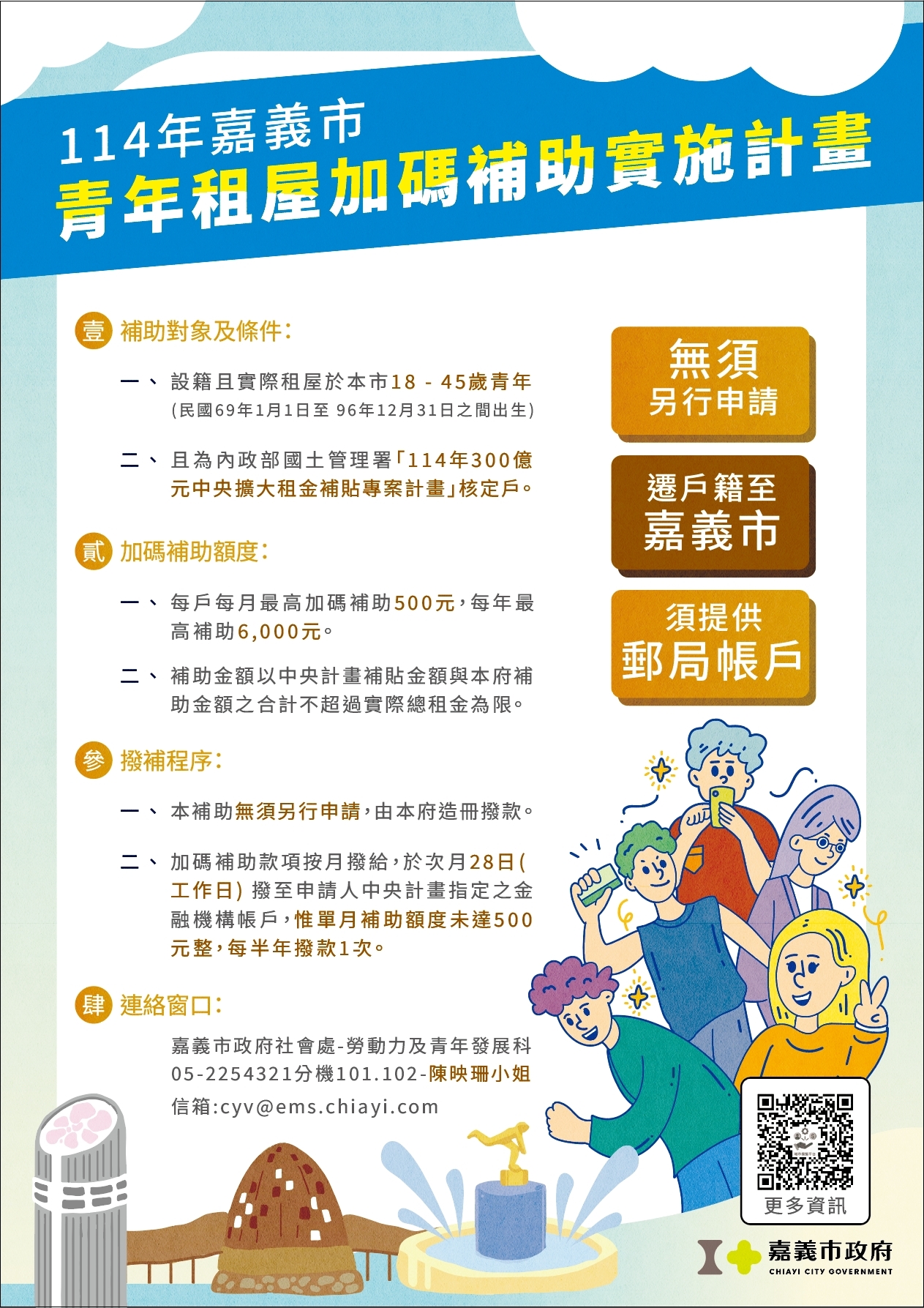 為落實十大旗艦計畫 -青世代磁吸 策略之青年宜居政策, 促進人才就業,推進移居增加就學、就業關係人口成為嘉義市 (簡稱本市 )戶籍人口,提升本市青年設籍率, 配合內政部國土管理署 「 114年 300億元中央擴大租金補貼專案計畫 」 (簡稱中央計畫 ),提供加碼租金補助 ,以減輕『青年』租屋負擔 。