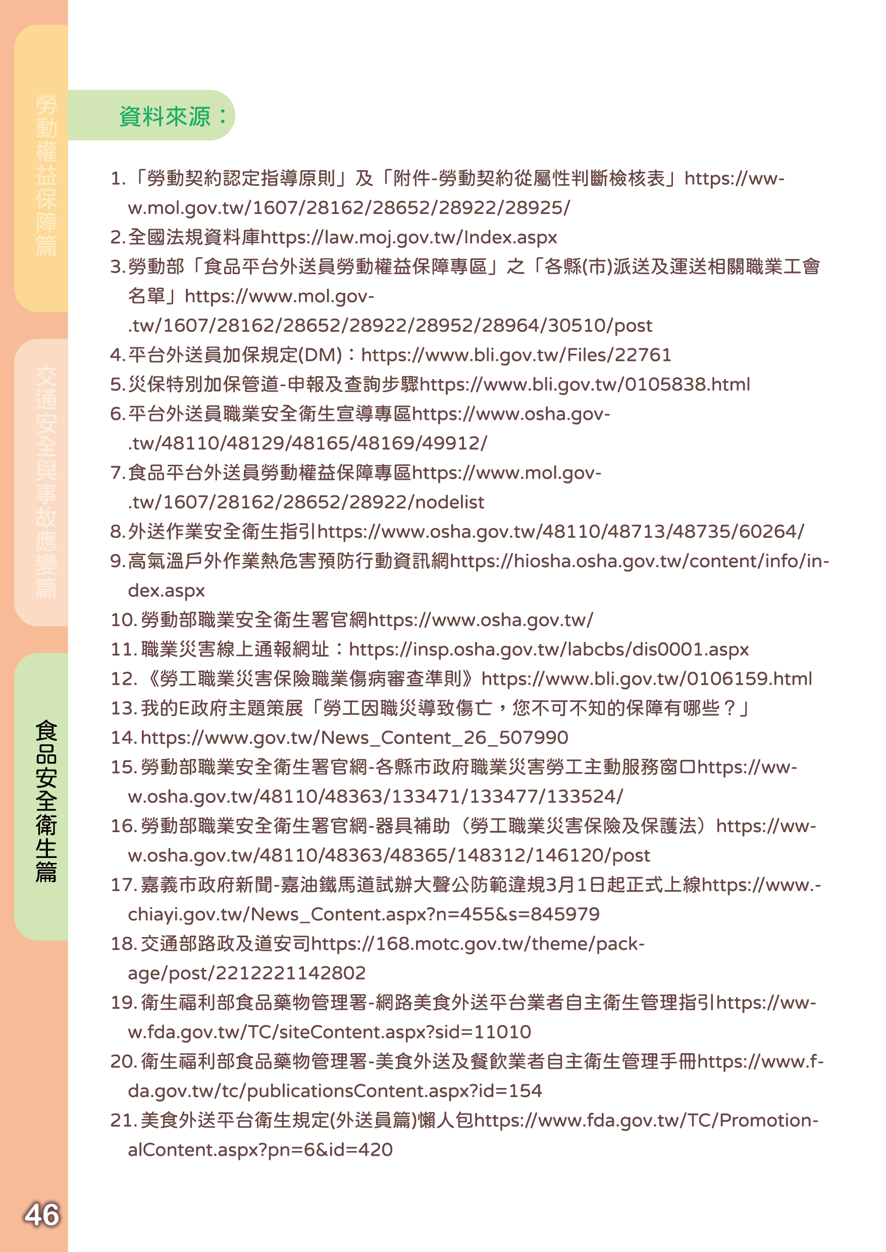 - 政府機關相關諮詢及服務訊息-提供投保權益、勞動條件、職災、交通法規與事故及食品安全衛生等諮詢服務訊息