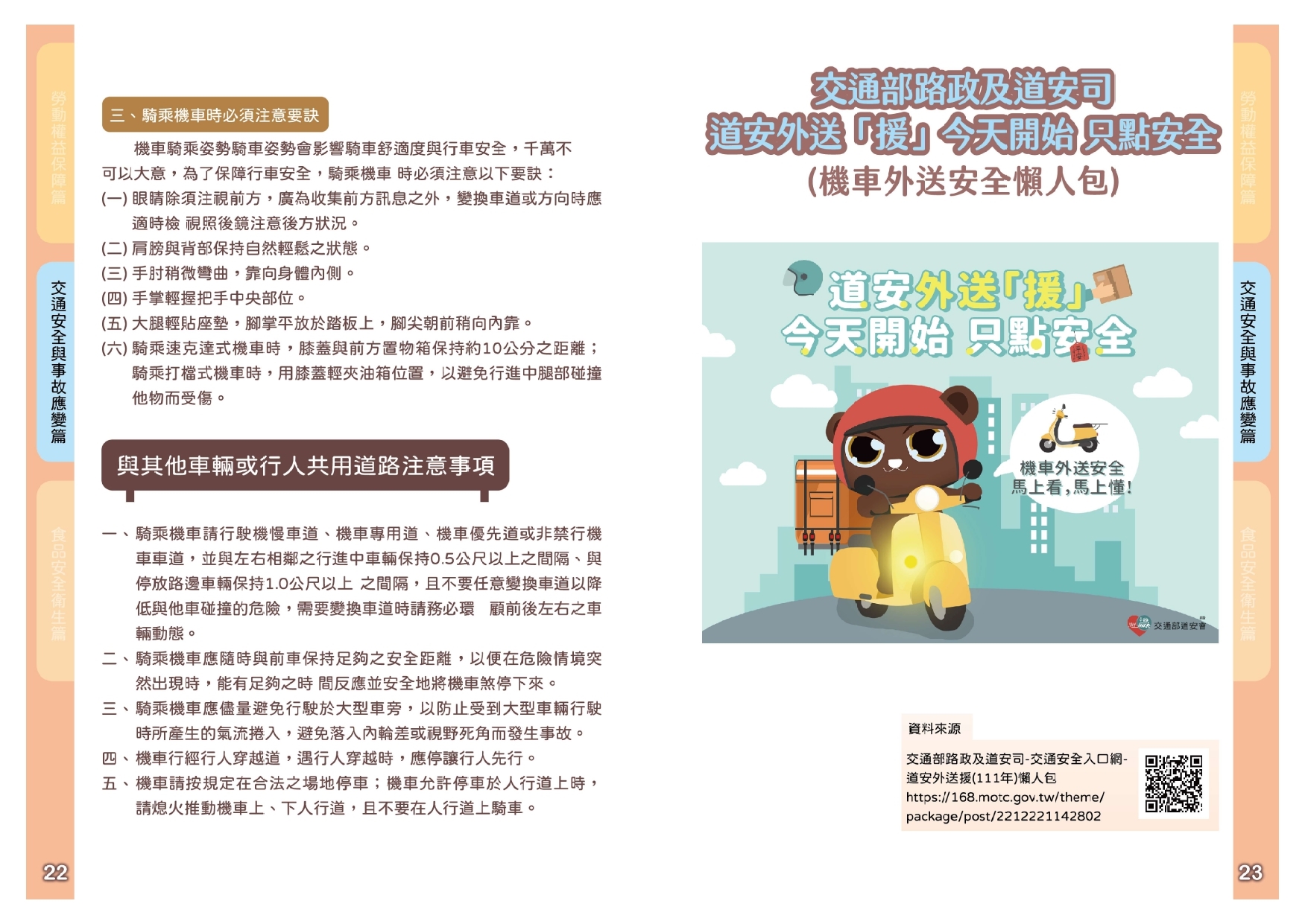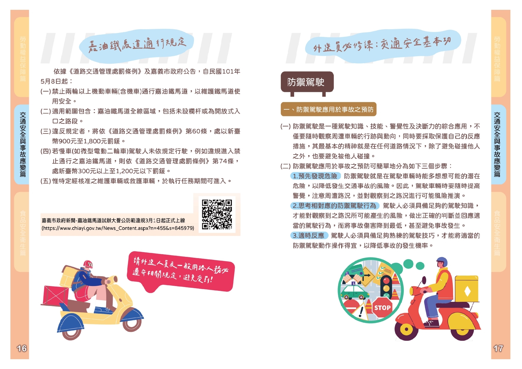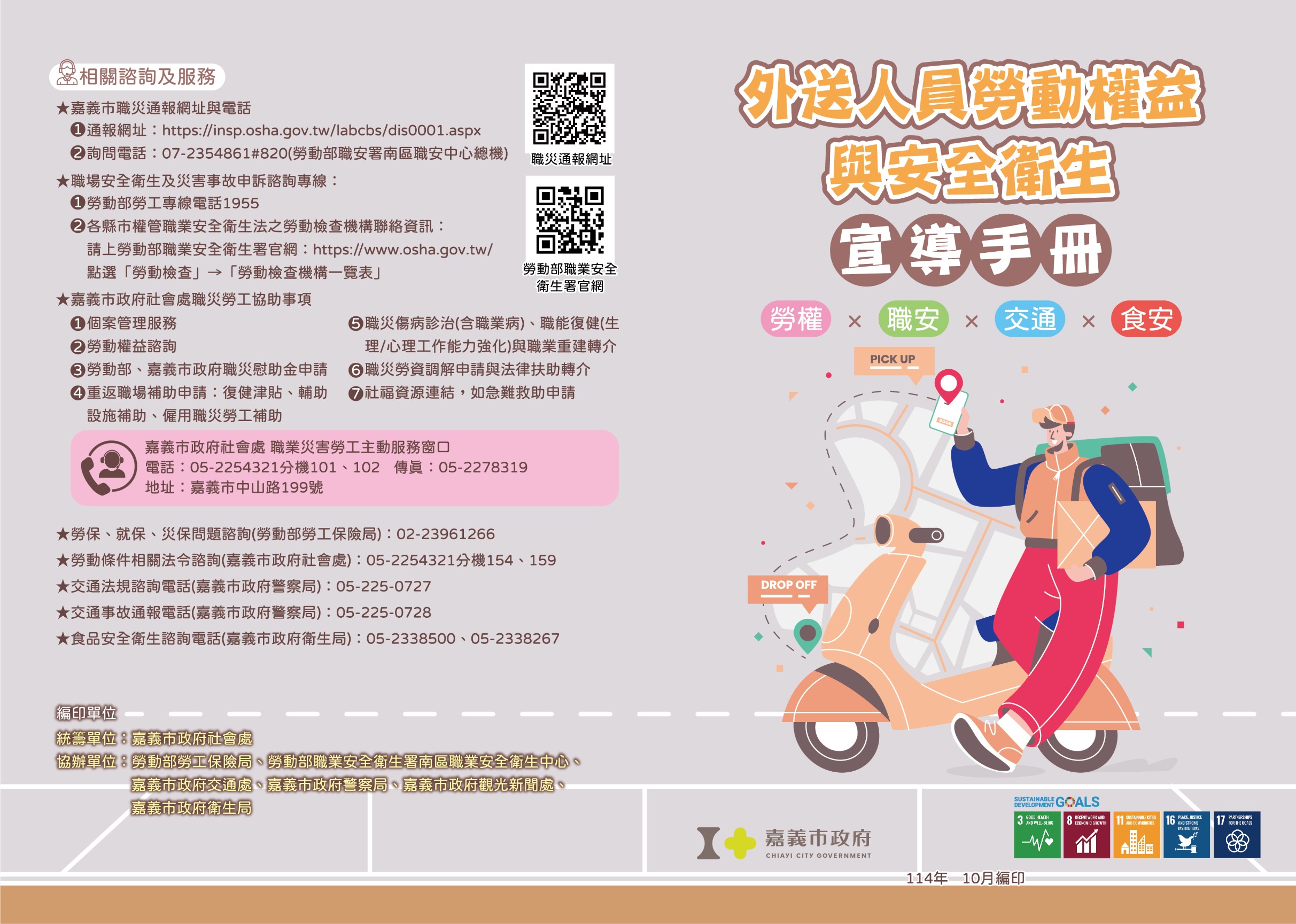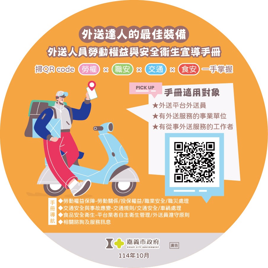 嘉義市政府跨機關合作,由市府相關單位(社會處、交通處、警察局、觀光新聞處、衛生局)及中央機關(勞動部勞工保險局、勞動部職業安全衛生署南區職業安全衛生中心)攜手合作,整合「勞動權益 × 職業安全 × 交通安全 × 食品衛生」四大主題,彙編成《外送人員勞動權益與安全衛生宣導手冊》,協助外送平台、事業單位及外送人員了解外送工作者的權益與安全責任,共同打造安全、安心與友善的外送服務工作。