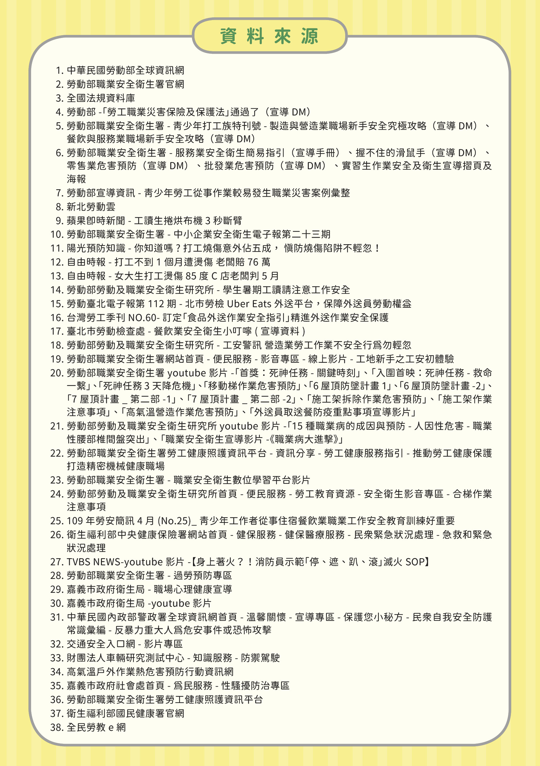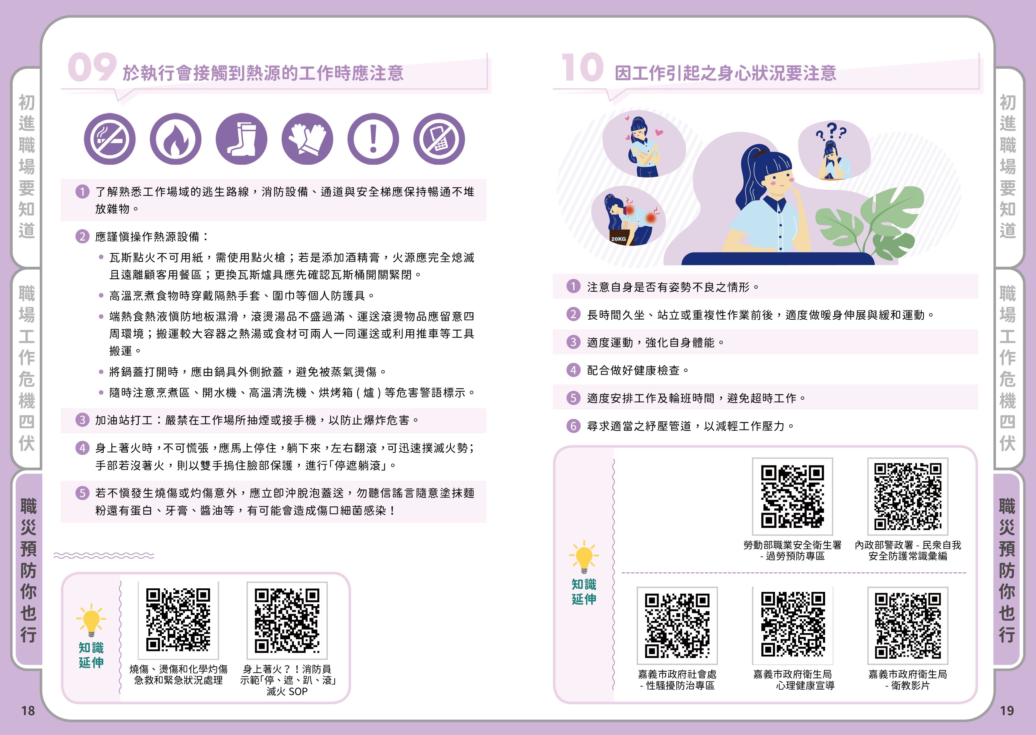 為使應屆畢業生、平時工讀、工廠實習學生、及青年、青少年勞工朋友們,建立職業安全衛生意識與相關知識,本府彙整相關資料來源,製作「青少年勞工職場安全宣導手冊」,手冊內容包含「初進職場要知道」、「職場工作危機四伏」及「職災預防你也行」三大主題,以期盼協助職場青年、青少年提升辨識可能發生職業危害風險之能力,並同時強化遭遇職業災害事故發生的應變能力。