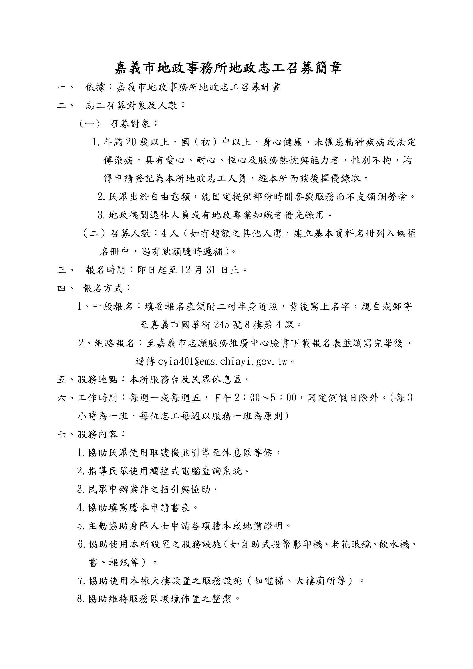 地政志工召募活動至12月31日止歡迎上網或洽詢嘉義市地政事務所總務課報名